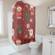 A charming Christmas pattern shower curtain featuring adorable teddy bears dressed as Santa, festive gift boxes, decorated Christmas trees, candy canes, ornaments, and snowflakes on a deep red background. This cozy holiday design blends warm, hand-drawn illustrations with a playful winter feel.