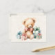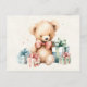 A postcard with a cute illustration featuring a Victorian style teddy bear. Wearing a fancy red bow. Drawn in a a cute old fashioned vintage style. Red and blue pastel Christmas presents surround this warm-hearted bear.