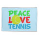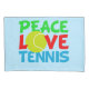 Peace Love Tennis on a pretty blue background written in red, blue, and green with a yellow tennis ball in the word LOVE.