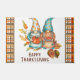 Cute Thanksgiving-themed front door mat features a pair of gnomes holding pumpkin and pie with Autumn coloured plaid background.