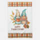 Cute Thanksgiving-themed kitchen towel features a pair of gnomes holding pumpkin and pie with Autumn coloured plaid borders.