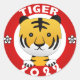 Cute tiger is looking through a circle frame which is decorated with flowers and texts. This is a digital illustration.