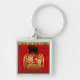 In a square are One black Tiger paper-cut, placed above a golden square shape inside of which is the second tiger with ideogram. Behind the scene there is a red background on which decorative and ornate letters form the words: TIGER YEAR. Design on square metal keychain. Matching greeting card, holiday postcard, sticker and more... Perfect for Chinese New Year of the Tiger 2022 or birthday (people born in Tiger Year).