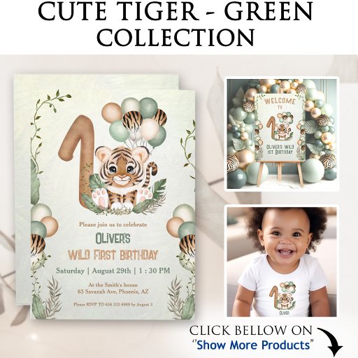 Cute little tiger cub and balloons any Birthday toddler T-Shirt. Soft sage green and beige colours, safari balloons, and jungle greenery. Easily personalise all the text and please visit the store for matching items :) - Kate Eden Art