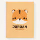 This design features cute tiger cartoon illustration with personalised name in brown modern sans serif font style on pastel orange background.
