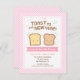 Invite your friends over for a New Year celebrations with this cute pun amusing invitation design! The casual handwritten like text reads "Toast to the New Year!" Instead of champagne and raising your glasses, how about toasts of cute smiling bread with colourful confetti in shapes of circles, stars and squares flying in the background. A pink and white slanted stripes pattern in the background. The recipients are going to smile on receiving this fun and cheerful cartoon invitation!