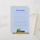 At the bottom of this lined stationery, a cute train is on the railroad tracks. The light blue paper also has dark blue display text at the top for the boy's name. You can edit the black text to show the child's name.