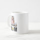 Cute "Travelling Mum" black distressed Text, with fun images of a packed vintage suitcase, Passport, Aeroplane flying towards sky, and two custom photos on a Coffee Mug.