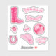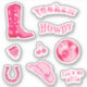 Sticker set in pink tones, faux glitter: cowboy boot, disco ball, horseshoe, cowgirl hat, groovy typography "howdy", "yeehaw", "let's go girls" with mirror ball cherry, glittery strawberry, western country / disco / coquette aesthetic, will make a perfect gift for teenager, bestie, graduation, birthday, bachelorette last rodeo party as party decoration, stationary, as favour bag or envelope seal stickers, or for diary, journal, scrapbooking decoration and other crafts