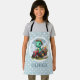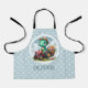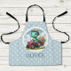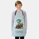 This personalised adorable kids' apron design features a charming little dinosaur joyfully driving a miniature red tractor carrying flowers on a pale blue and white polka dots background. With its playful expression and soft dreamy colours, this delightful creation adds a touch of enchantment to any space, appealing to everyone, especially kids and babies.