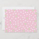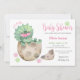 Dinosaur theme girl baby shower invitation features a cute baby Triceratops with flower headband hatching from an egg with "It's A Girl!" lettering. Reverse side is a pattern of white and mint green dinosaur footprints and polka dots on a pink background. Original artwork KL Stock.