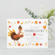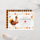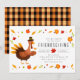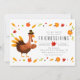 This Friendsgiving invitation features a cute turkey holding a wine glass, set against a background with pumpkins and fall autumn leaves. The invitation is set on a simple white background with a coordinating plaid background.