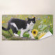 Cute tuxedo cat on a tree branch with sunflowers - bath towel set