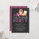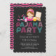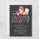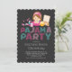 Cute scallop die cut sleepover party invitation featuring a brunette girl on a pillow with a bowl of popcorn, pizza and makeup items set on a classy black background. Our stylish, modern & fun pajama party invite has chevron typography letting in pink, turquoise blue & light pink. Flip our slumber party invite over to view a coordinating chevron stripe back for an extra special touch. Perfect for a tween birthday party or teen birthday party.