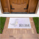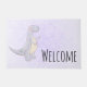 A welcome door mat with a cute illustration featuring a grayish purple dinosaur.