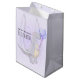 A birthday gift bag with a cute illustration featuring a grayish purple dinosaur. Holding 3 purple heart balloons.