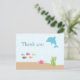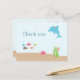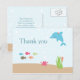 This girl's birthday party thank you postcard has an adorable Under the Sea theme. On the right, there is a cute dolphin swimming at the top. At the bottom, there is a seahorse swimming around some seaweed and a crab walking at the bottom. On the left, there is a school of fish swimming towards the bottom. At the top left, Thank you is written. On the backside, there is a clam with a pearl in it and some seaweed at the bottom. You can easily personalise the Thank you message or delete the text to hand write in your message at home. There is a soft blue background with lots of white bubbles. This could be used as a Thank you card for a Baby Shower or a Birthday party! Some design elements by STOCKBERRY STUDIO