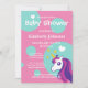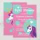 Cute unicorn baby shower invitations for new baby girl. Custom party invites with little hearts and magical horse. Girly babyshower template design with pink and turquoise blue pastel colours. Beautiful stylish typography with little love icons. Personalizable text with RSVP and registry line. Adorable cards for your little princess daughter or granddaughter. Classy paper designs for pregnant women or mum to be.