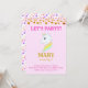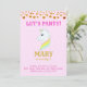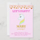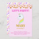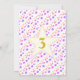 Cute Unicorn Birthday Invitation. Lovely golden polka dot header, unicorn with three colour rainbow and star pattern on pink background. The back side has multi colour polka dots and the number 3 inside a star. All texts and numbers can be personalised.