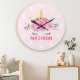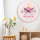 Cute Unicorn Eyelashes Girls Bedroom Wall Clock. This design features a beautiful unicorn surrounded by gold stars and floral flowers. Pastel pink magical fantasy wall clock for girls. Personalise this custom design with your own name or text.