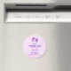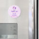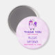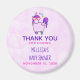 A baby shower thank you magnet with a whimsical drawing of a cool and funky pink cubby unicorn which has a purple mane and tail. This cute creature is wearing heart-shaped sunglasses and is decorated with little stars. Pink watercolor background.