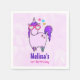 Birthday party paper napkins with a whimsical drawing of a cool and funky pink unicorn which has a purple mane and tale. This cute creature is wearing heart-shaped sunglasses and is decorated with little stars. Pink watercolor background.