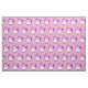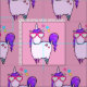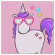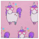 Patterned fabric with a whimsical drawing of a cool and funky pink cubby unicorn which has a purple mane and tail. This cute creature is wearing heart-shaped sunglasses and is decorated with little stars. Pink background.