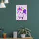 A poster with a whimsical drawing of a cool and funky pink cubby unicorn which has a purple mane and tale. This cute creature is wearing heart-shaped sunglasses and is decorated with little stars. Pink watercolor background. Perfect for a little girls bedroom.