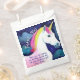 Cute Unicorn Magical Stars Girl Birthday Thank you Favour Bag. These beautiful and magical bags are perfect for a special birthday girl to thank hers birthday party guest. The bags feature a cute and beautiful unicorn drawing and colourful stars on a cloudy sky. Personalise it with your text and name.