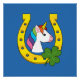 An illustration of a cute white unicorn with rainbow hair on a golden horse shoe with a green shamrock clover leaf for St. Patrick's Day. This beautiful fairytale and magical animal design is a gift idea for whimsical lovers and good luck charm lovers.