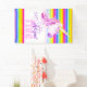 5th birthday party banner, featuring a cute whimsical unicorn watercolor painting and colorful rainbow stripes. Personalize with your own birthday party details, currently reads, Abigail is turning five. Gallop on over. Unique drawing, watercolor painting art and graphic design by Sarah Trett www.sarahtrett.com for www.mylittleeden.com