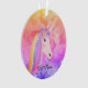Cute Unicorn Rainbow Colourful Clouds Personalised Ornament makes a great gift idea for a child who loves unicorns. Background designed with rainbow colours and a cute white unicorn styled with rainbow hair, flowers on her head and name in script.