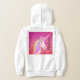 Cute Unicorn Rainbow Fantasy Pink Glitter Name Hoodie is designed to girls who love the magical unicorn and glam. The white hooded sweatshirt has a big white unicorn face and head on the back center and she has rainbow hair and flowers on top of her head. The background is pretty sparkly pink and gold colorful faux glitter sparkles. Personalized with name in black calligraphy script lettering vertical of the unicorn's head. Makes a great fashion choice for unicorn lovers!