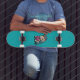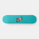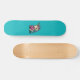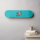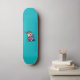 A turquoise dominant skateboard with a cute illustration of a unicorn holding a purple fluffy heart and colourful hair. Great design for female riders.