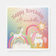 The background is a rainbow gradient pattern. Two cute unicorns are pictured at the top with little rainbows, clouds, and the sun. A sample Happy Birthday message and name are printed in a pretty pink font. You can personalise the napkins to include your own custom name or text.