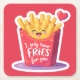 A cute and colorful cartoon illustration of a red French fries carton with a happy kawaii smiling face. The design features a floating red heart and the romantic funny pun quote "I only have FRIES for you". The image has a white sticker border, making it perfect for Valentine's Day greeting cards, fast food lovers, and humorous romantic gifts. Isolated design.