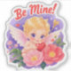 Adorable Valentine's Day illustration of a cute blonde Cupid angel holding a red heart and golden arrow, surrounded by pink flowers and the romantic text "Be Mine!"