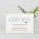 This blue and grey baby shower invite includes an adorable bow-tie and a simple vintage frame.