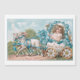 Cute whimsical vintage girl in lacy white frock sitting in an egg-shaped cart with lily wheels being pulled by two white lambs decorated with blue forget-me-nots. "A Happy Easter" message in gold is inscribed on the carriage.