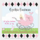 A cute new baby girl keepsake featuring a baby in a pink vintage baby carriage on a grassy lawn, garnished with pink birds and a pink bunny rabbit, against a pastel blue sky with puffy white clouds. Top centre in large decorative lettering is the child’s name, and below and across the bottom in pink lettering is the child’s birth date and time of birth, length and weight. A perfect keepsake for the new baby girl. All this on a pink, black, and white (diamond) argyle background. A great gift idea for new parents.