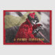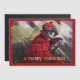 Old Edwardian era photo from 1900s, digitally rendered and colored, with a girl in red coat and hat with poinsettia flower and veil at steering wheel, it's snowing and she's smiling and driving a car, with golden message "A Merry Christmas". Perfect holiday card to put a smile on your face.