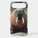 Walrus themed phone case. A cute walrus laying on a sandy beach by the ocean on a sunny day. Background of cliffs and blue ocean waves.