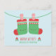 A cute pair of winter socks in green and red are hanging on a green line using pink pegs. The matching text reads "Warm Wishes!" which is perfect for the Christmas holiday! Decorated with mistletoe.