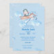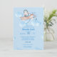 Cute Watercolor Blue Penguin Pilot Invitation with a textured background, blue clouds. The background has blue background with white patches. Mum to be will love this cheerful boys baby shower invitation.