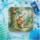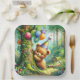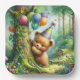 Birthday party paper plates for a kid's woodland themed birthday party. Sweet baby bear cub by a tree surrounded by birthday balloons in blue, yellow, green, orange and purple.