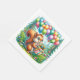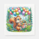Squirrel themed birthday party paper napkins for a little girl or boy's woodland themed birthday party. Sweet squirrel holding a birthday gift surrounded by birthday balloons in blue, yellow, green, orange, purple and pink.
