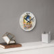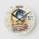Wall clock featuring a watercolor illustration of a giraffe on books at night time with a moon and stars. A cute fantasy wall clock for a baby or toddler or younger child.