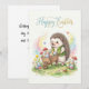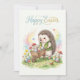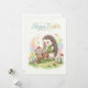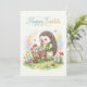 A charming watercolor illustration of an adorable hedgehog holding a floral pink umbrella with Easter eggs on soft grass. Perfect for a whimsical spring greeting.