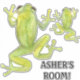 Fun little boy's wall art or door decal with a bright lime green tree frog pair and your son's name or phrase. Hand painted in watercolor, copyright, Audrey Jeanne Roberts.