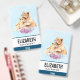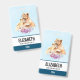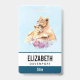 Personalised name badge with a cute watercolor painting of a mother lion holding her baby cub. A pretty purple floral bouquet below them, adds a gentle touch to this sweet and adorable image. Light blue background.